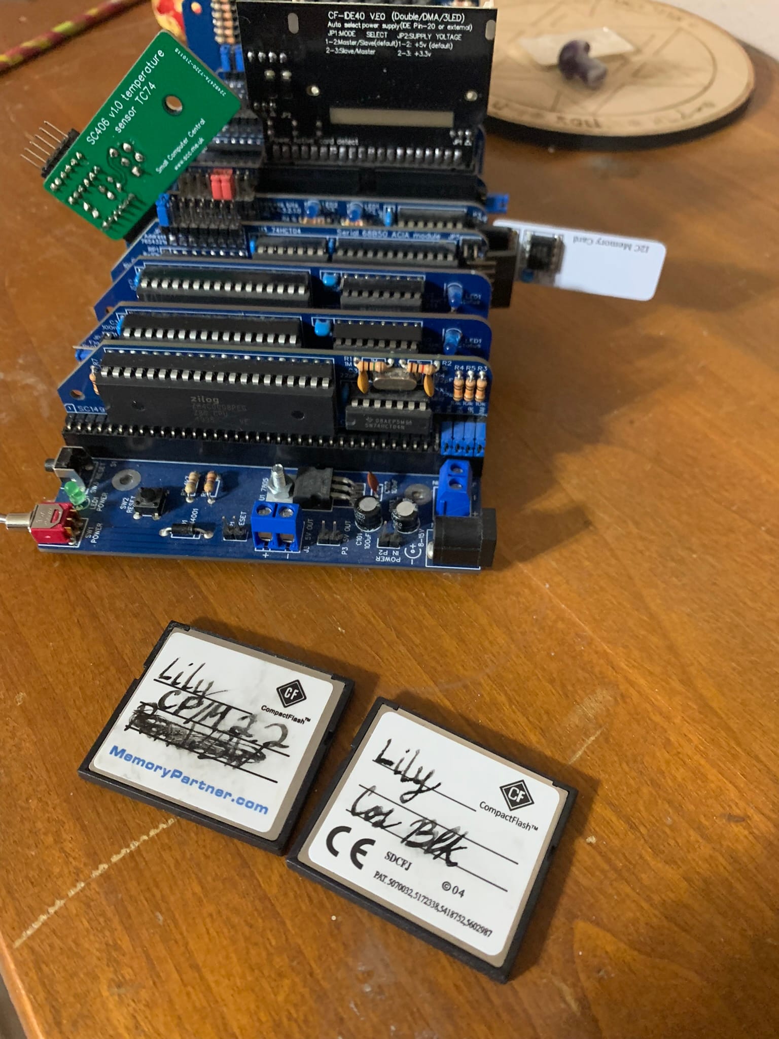 The SC720 is probably the single most capable board in the SCC lineup, at least in the Z80 range, and the more I learn with it the more I'm blown away by it. This base SC720 is extended semi-permanently with a Real-Time Clock module (SC727) and an i2c Bus Master module (SC704). It can also be connected to external backplanes to expand even further, though it begins to take up a good deal of space when doing so.